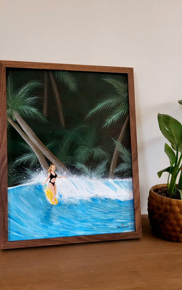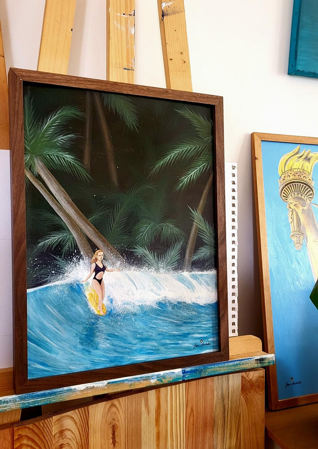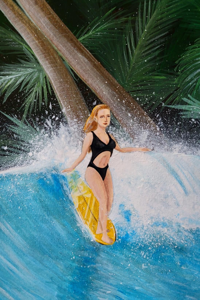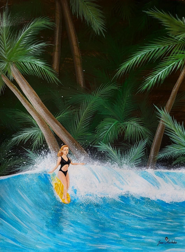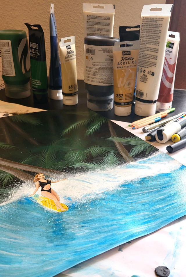 Une pièce unique, réalisée à la peinture acrylique et sublimée par des finitions aux marqueurs à peinture ainsi qu'aux crayons à aquarelle.